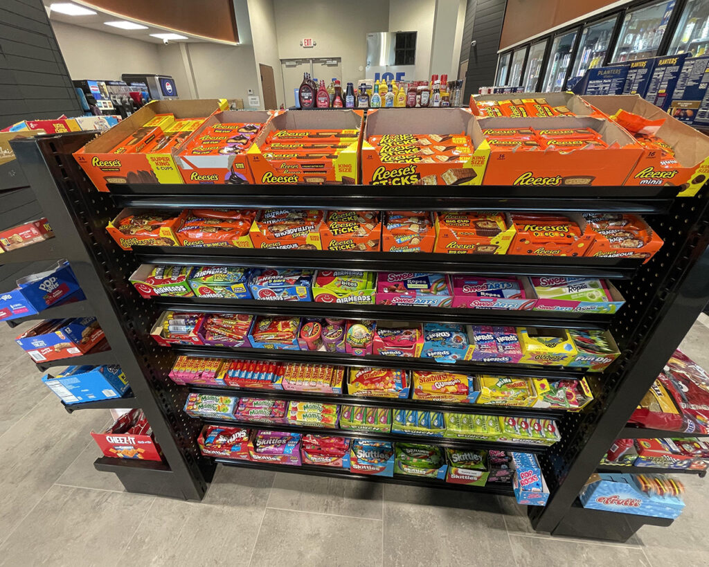 Market on the Stage sells household supplies like paper towels and toilet paper. It also offers snacks such as chips and candies, and has a selection of beer and wine items.